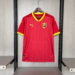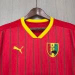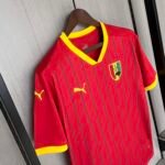 A camisa titular da Seleção de Guiné é predominantemente vermelha e traz diversas linhas verticais verdes no corpo. A gola e os punhos têm a cor amarela.