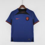 A camisa reserva da  Holanda também traz o template da  Nike como base, agora na cor azul escura. Detalhes pretos são vistos na parte frontal da gola, no cabide, na parte interna da nuca, bem como nas axilas e nos punhos, que trazem frisos em um tom de laranja avermelhado.