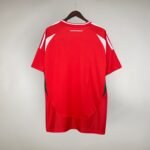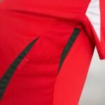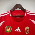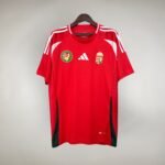 A camisa titular da Hungria para a Euro é baseada no novo template da marca alemã e é bem simples. Ela é predominantemente vermelha, com os arcos padrão do modelo, nas laterais, em verde, enquanto os detalhes nas axilas, as três listras nas mangas e a faixa centralizada na gola têm a cor branca.