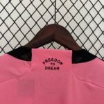 A nova camisa titular do Inter de Miami segue o template padrão da marca alemã, com a cor predominante sendo um novo tom de rosa chamado “Easy Pink”. As faixas laterais que se encontram na barra traseira são pretas, assim como as dorsais, a gola, as três listras nas mangas e os punhos. Na nuca, a frase “Liberdade para Sonhar” está escrita em inglês, enquanto na barra está em espanhol, representando, segundo o clube, a dualidade do time.