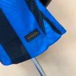 A gola é redonda com a parte frontal preta e a nuca azul, seguindo cores que são aplicadas na região da clavícula, ombros e mangas, sendo que os punhos são pretos com bordas azuis. Nas costas, o detalhe abaixo da nuca, se torna azul, ao invés de preto, mas as costas permanecem listradas.