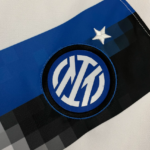 A Nike estampa o Swoosh em azul, no lado direito do peito, enquanto o escudo da Internazionale é colocado no lado esquerdo, em sua versão atual padrão. O logo da Paramount+ é aplicado em preto, apenas com o escrito, região em que a faixa é interrompida.