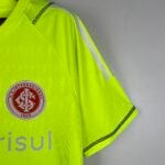 A camisa do Internacional para goleiros é uma peça vibrante, com um design que chama a atenção. Seu tom amarelo-limão fluorescente é altamente visível, com detalhes em branco que proporcionam um contraste marcante. No lado esquerdo do peito, o emblema do Internacional se destaca em vermelho com contornos brancos, representando com orgulho a equipe. No lado direito do peito, está o logotipo da Adidas, em branco, simbolizando a parceria entre o clube e a marca esportiva.