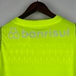 No centro da camisa, o patrocínio do “Banrisul” aparece em branco, harmonizando com os demais elementos. As mangas da camisa apresentam listras brancas nos ombros, uma característica icônica dos uniformes da Adidas. Um detalhe único é a presença de polígonos que se assemelham a diamantes, espalhados por toda a parte em que predomina o amarelo-limão, conferindo um aspecto de modernidade e sofisticação à peça.