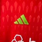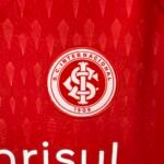A camisa do Internacional é predominantemente vermelha, com detalhes em verde limão nos ombros, representando as três listras características da marca Adidas. No lado esquerdo do peito, destaca-se o emblema do Internacional, enquanto no lado direito está o logo da Adidas em branco, ambos símbolos de prestígio e qualidade. O centro da camisa exibe o patrocínio da Banrisul em branco, harmonizando com os demais elementos.