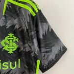 O escudo do Inter é aplicado no lado esquerdo do peito, apenas com o monograma, e assim como o logo da Adidas e o patrocínio máster da Banrisul, aparecem no mesmo tom de verde.