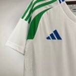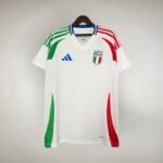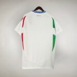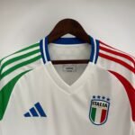 No lado direito do corpo, as três listas na manga são verdes, mesma cor da curva na barra e detalhes do template nas axilas e dorsais. No lado esquerdo, isso tudo é vermelho. A gola traz o mesmo design do manto titular, nas cores azul e branca. Na nuca é possível ver a frase “L’Itália Chamò”.