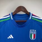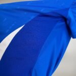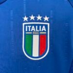 Enquanto isso, nas laterais do corpo, é utilizada uma tonalidade mais escura do azul royal. As três listras nas mangas trazem as cores da bandeira nacional, enquanto a faixa centralizada na gola é branca. Na nuca é escrita a frase “L’Itália Chiamò”, retirada do hino nacional.