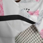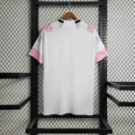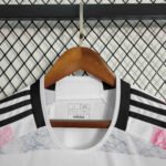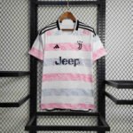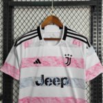 A camisa reserva da Juventus para 2023-2024 é baseada no template padrão da marca para a Copa do Mundo, é predominantemente branca e apresenta listras horizontais em rosa e cinza estilizados, que refletem os picos glaciais cobertos de neve dos Alpes italianos, espelhando a face rochosa do Monte Rosa que pontua o horizonte da cidade. Já as costas são lisas em branco. O preto aparece nas listras laterais que se juntam na barra traseira, nas três listras da marca, nas mangas e laterais da gola.