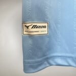 A gola é V em branco, cor também vista nos punhos. Já o escudo da Lazio é acompanhado de uma inscrição que recorda o título “73 – 74 – Campioni d’Italia”. O logo da Mizuno é aplicado em branco, no lado direito, enquanto na nuca, a bandeira da Itália é vista.