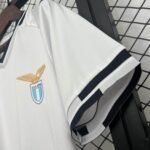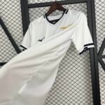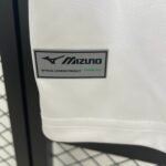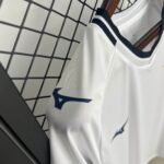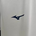 A camisa conta com gola em V e punhos com inserções em azul ardósia escura, oferecendo um contraste sofisticado. O escudo do clube é aplicado no lado esquerdo do peito, enquanto o logo da Mizuno é visto em azul ardósia, no lado direito do peito e nos ombros.