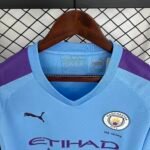 A camisa titular do Manchester City para a temporada 2019-2020 é predominantemente azul celeste com gola V e o detalhe que mais chama a atenção, é a presença de detalhes roxos nas mangas.