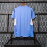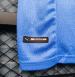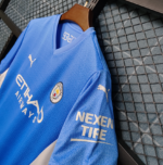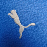 A PUMA estampa o felino em branco nas mangas e no lado direito do peito, enquanto o escudo do City é colocado no lado esquerdo, em sua versão atual padrão.
