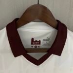 A gola é polo na cor bordô, que também é vista nos punhos que complementam as mangas e em selo na parte interna da gola que traz uma silhueta de uma fábrica com a palavra “CITY” e o ano de fundação da equipe “1894”, se parados pela rosa de Lancashire.