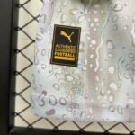 O escudo do clube aparece com acabamento transparente, remetendo à aparência da água em janelas, enquanto um gradiente de verde para azul conecta o logotipo centralizado da PUMA, o brasão e as meias, lembrando a iridescência da água.