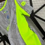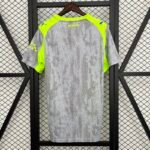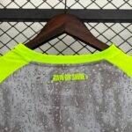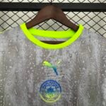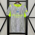 A nova terceira camisa do Manchester City traz a cor cinza predominante, inspirada no asfalto e na cor do céu mais comum da cidade, e carrega um padrão detalhado de gotas de chuva que se estende também para o shorts, contrastando com vibrantes detalhes em verde neon no pescoço, ombros e painéis laterais.