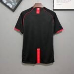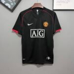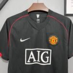 A icônica camisa do Manchester United na temporada 2007/2008 marcou uma das últimas incursões na temática “black”. Esta peça singular destaca-se por ser uma das raras camisas dos “Red Devils” totalmente em preto, com apenas uma sutil linha vermelha que se estende da gola até as mangas, rompendo a autoridade do negro predominante. A gola em V, de design sutil, adiciona um toque de elegância.