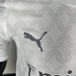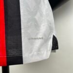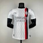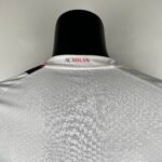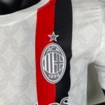 O escudo do Milan é aplicado no lado esquerdo do peito, em uma versão branca e prata, enquanto no lado direito, o logo da PUMA é aplicado em prata, cor também vista no patrocínio máster que no modelo masculino é da Emirates.