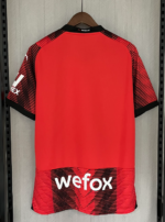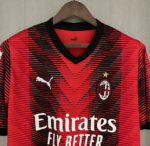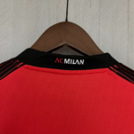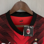 Nas costas, essas listras são interrompidas por um grande box vermelho, enquanto a gola V e os punhos têm a cor preta. Já na nuca é escrito o nome do clube, AC MILAN, em vermelho e branco.
