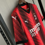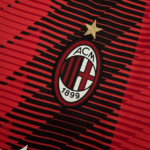 O escudo do Milan é aplicado no lado esquerdo do peito, em sua versão atual padrão, enquanto no lado direito, o logo da PUMA é aplicado em branco, cor também vista no patrocínio máster que no modelo masculino é da Emirates.