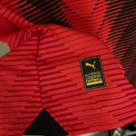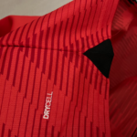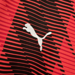 A nova camisa titular do AC Milan é predominante vermelha e traz duas largas listras estilizadas no corpo, bem diferente do que estamos acostumados a ver. Segundo o clube, o gráfico tonal repetitivo celebra a energia vibrante da cidade, o legado do clube e seu papel central em uma comunidade em evolução que está sempre olhando para frente, criando um ‘M’ repetido no centro da camisa em listras tonais que representam a cidade de Milão e a natureza progressiva do clube.