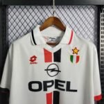 A icônica camisa do Milan nas temporadas de 1995 a 1997, modelo Away, trouxe um visual imponente e elegante que reforçou a tradição rossonera fora de casa. Predominantemente branca, ela se destacou pela faixa horizontal em vermelho e preto atravessando o peito, elemento clássico que simbolizou a identidade do clube. A gola polo, também branca, recebeu sutis detalhes em vermelho, adicionando refinamento ao design. O escudo do Milan e o logo da Lotto, posicionados de forma equilibrada, completaram a composição de uma das camisas mais emblemáticas da era de ouro do time milanista nos anos 90.
