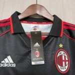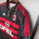 A camisa é predominantemente preta, com listras horizontais em vermelho. Em destaque no centro, há um grande logotipo da Opel em branco, dentro de um círculo, com a palavra OPEL em vermelho. No lado esquerdo do peito, encontra-se o logotipo da Adidas em branco, acompanhado pelo emblema do AC Milan e a data 1899 abaixo. No lado direito do peito, destaca-se uma estrela dourada acima do emblema do clube. O canto inferior esquerdo da camisa apresenta um pequeno emblema do AC Milan.