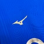 O escudo do clube aparece bordado sobre o coração, numa versão vazada em dourado, acompanhado do “Runbird” — símbolo da Mizuno — do lado oposto, que aparece na mesma cor, assim como o patrocínio máster.