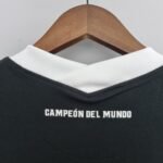 A gola é V, assim como os punhos, já as costas da camisa é lisa, com a frase “Campeón del Mundo” (Campeão do Mundo), aplicada em branco na nuca.