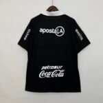 A camisa reserva do Olimpia traz a cor preta como predominante e apresenta a faixa horizontal em branco, cor também utilizada na gola polo.