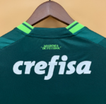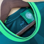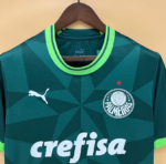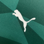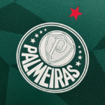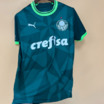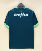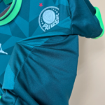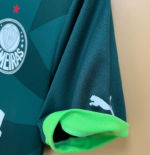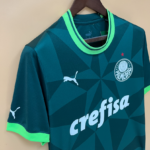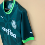 O escudo do Palmeiras está em sua versão oficial no lado esquerdo do peito, enquanto os logos da PUMA aparecem em branco no peito e nos ombros, bem como os patrocínios.
