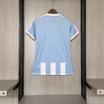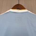 A gola é redonda em branco com filetes dourados na nuca, que representam as glórias do clube. O mesmo padrão também é visto nos punhos.