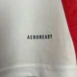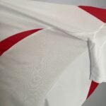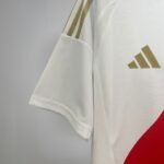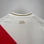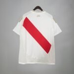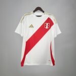 A nova camisa titular do Peru é baseado no template Tiro24 da marca e tem o design tradicional, com o branco como predominante e a faixa transversal vermelha, tanto na região frontal como na das costas. A cor volta a aparecer nos arcos laterais, padrões do modelo, que no lado direito ainda se junta à faixa. As três listras da marca vão nas mangas, em dourado, mesma cor da faixa centralizada na gola e da frase “Unidos sempre”, na nuca.