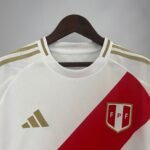 A Adidas estampa seu novo logo em dourado, no lado direito do peito, enquanto o logo da Federação Peruana é colocado no lado esquerdo, em uma versão atual padrão.