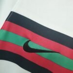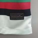 A camisa reserva do selecionado luso traz um tom de verde água bem claro e o grande destaque fica por conta de faixas horizontais em preto, vermelho, verde, vermelho e preto que são repetidas três vezes na parte frontal do manto.