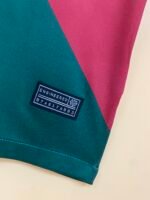 A gola é redonda na cor vermelha, enquanto as mangas serão também vermelhas, com a manga direita seguindo o corte e tendo parte dela na cor verde.