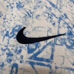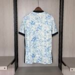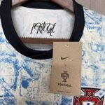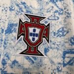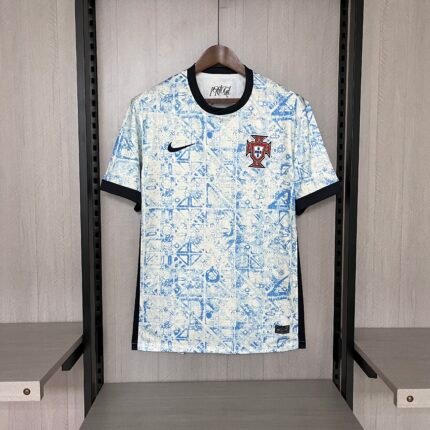 A camisa reserva é uma homenagem à arte arquitetônica tradicional do país. Predominantemente branca, apresenta um padrão gráfico inspirado nos típicos azulejos azuis, comuns em muitas casas brasileiras. As faixas laterais do template, as axilas, os punhos e a gola são pretos, destacando-se elegantemente sobre o fundo branco. A Nike estampa seu icônico Swoosh em preto no lado direito do peito, enquanto o logo da Federação Portuguesa é exibido em sua versão atual padrão no lado esquerdo.