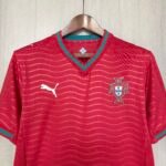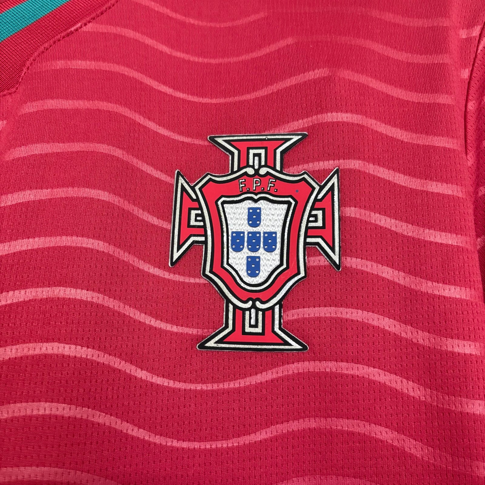 A nova camisa titular de Portugal é vermelha e traz gola V num formato especial, com o verde centralizado, mesmo padrão dos punhos. No corpo e mangas vão ondulações, num tecido brilhante, em uma referência ao Oceano Atlântico e às famosas navegações.