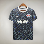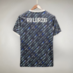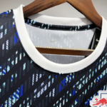 Para finalizar, a gola e as extremidades das mangas têm um acabamento em branco, que harmoniza com o restante do design, garantindo um visual equilibrado e elegante. Esses detalhes fazem da camiseta uma escolha ideal para os torcedores que buscam um produto de alta qualidade e estilo para torcer pelo RB Leipzig.
