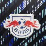 No lado esquerdo do peito, está o icônico logotipo da Nike em branco, símbolo de qualidade e excelência no esporte. Já no lado direito, encontra-se o distintivo do RB Leipzig, apresentando um touro estilizado em vermelho e branco, representando a força e a determinação do clube. Logo abaixo do emblema do clube, destaca-se o patrocínio da Red Bull em letras vermelhas, evidenciando a parceria entre o clube e a marca.