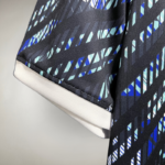 A camiseta possui um design marcante e único, caracterizado por um padrão de listras diagonais em diferentes tons de azul e branco, que cria um efeito visual dinâmico e cativante. Essa combinação de cores e padrões confere à peça um estilo moderno e vibrante, perfeito para os torcedores que desejam se destacar.