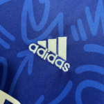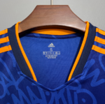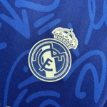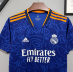 As três listras que percorrem os ombros também são azuis, enquanto o logo da Adidas, no lado direito do peito, é laranja. O escudo do Real é visto em sua forma oficial no lado esquerdo do peito.