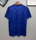 Predominantemente branca, ela traz detalhes azuis com finas linhas laranjas na gola redonda, padrão que é repetido nos punhos.