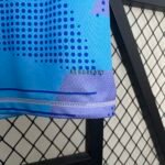 O manto dos goleiros traz o template da marca para a temporada na cor azul celeste, com os diversos detalhes em formas geométricas e retículas em tons de rosa e azul marinho.