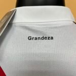 No manto masculino a gola é tipo polo, inspirada nas icônicas camisas do River dos anos 90, enquanto no feminino é V. Na parte traseira apresenta o slogan institucional “Grandeza”. As três listras vão nos ombros, em preto. A Adidas estampa seu logo em preto no lado direito do peito, enquanto o escudo do River Plate é colocado no lado esquerdo, em sua nova versão, atualizada para 2022.