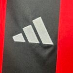 A peça traz listras verticais vermelhas e pretas. A gola é V na cor branca com friso vermelho na nuca, padrão que é visto também nos punhos. As mangas são pretas, assim como as laterais, onde são vistas linhas brancas que percorrem o kit.