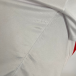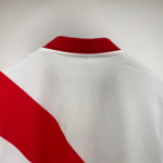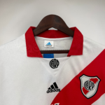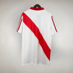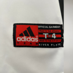 A camisa do River para a temporada de 1998/1999 é predominantemente branca, destacada por uma faixa diagonal vermelha que se estende do ombro esquerdo até a lateral direita. A gola é vermelha, complementando as três listras vermelhas presentes nas mangas. No lado esquerdo do peito, está o icônico escudo do River Plate, com as letras “CARP”. Logo abaixo do escudo, no centro da camisa, encontra-se o logotipo da Adidas. A faixa vermelha é atravessada pelo patrocínio da marca “Quilmes”, que ocupa uma posição central e de destaque. Na parte inferior direita da camisa, há uma etiqueta preta com o logotipo da Adidas e a inscrição “T-4”, conferindo um toque final de autenticidade.