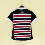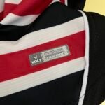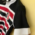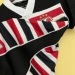 As laterais do manto são pretas com bordas brancas e a região das costas também trazem o listrado, sendo que na nuca, novamente a menção às conquistas são vistas em dourado.