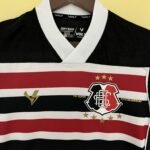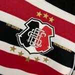 A camisa titular do Santa Cruz traz o tradicional estilo tricolor com faixas horizontais em vermelho, branco e preto, com o vermelho e preto sempre separados pelo branco.