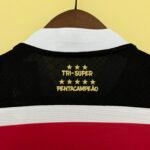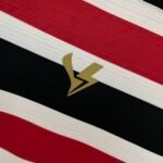 No peito, o escudo em TPU aparece no lado esquerdo, acompanhado de três estrelas ao topo, e cinco abaixo, que remetem ao “Tri-Super” e ao “Penta Campeonato”, que sao mencionados ao lado do símbolo em dourado, cor vista também no logo da Volt.